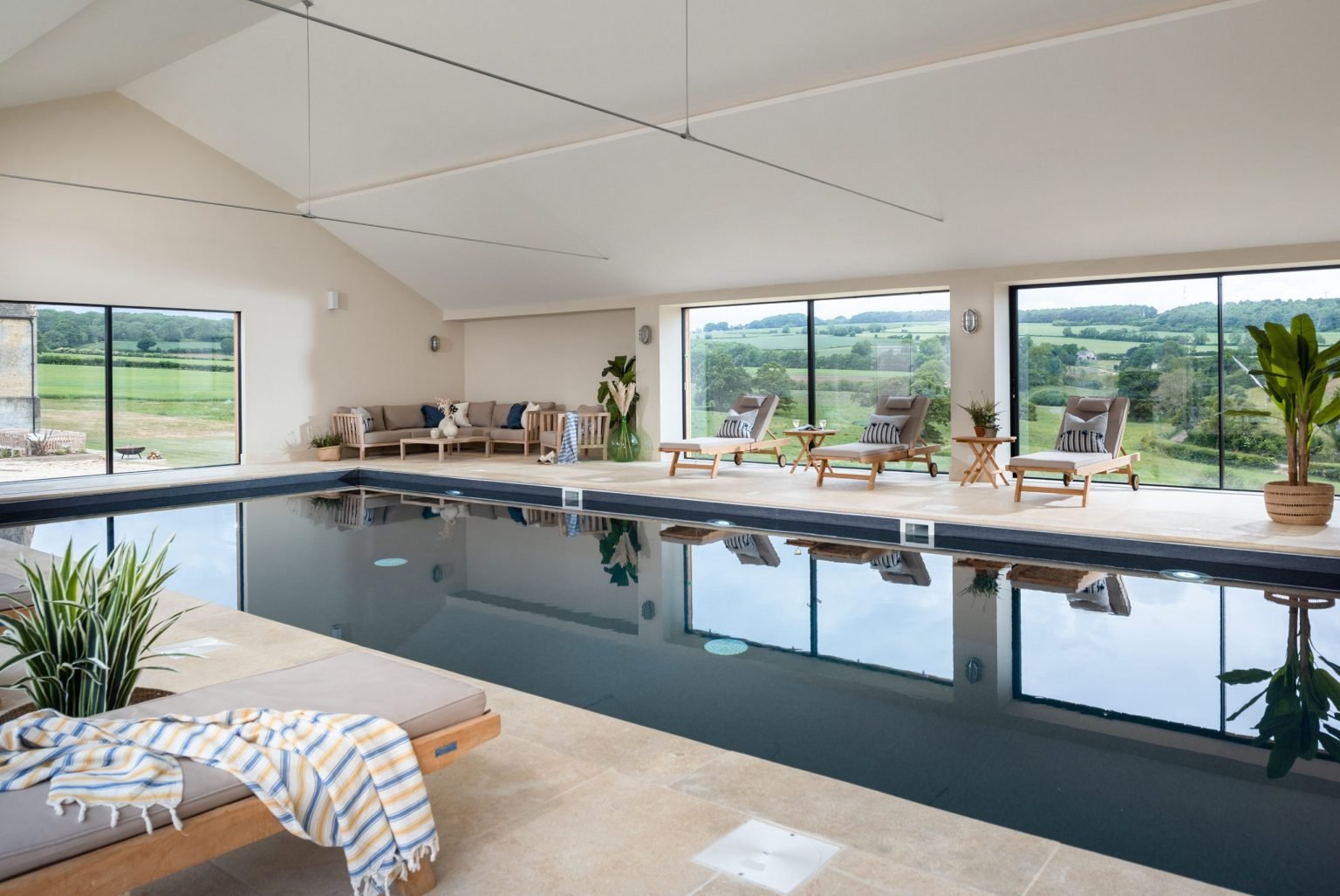 With a 300-year history, an indoor pool reminiscent of a members-only health club, and acres of countryside threaded with woodland paths, streams, and hidden corners to explore, this farm retreat feels both expansive and quietly tucked away. Thoughtfully restored and curated, the collection of modernised barns near Cheltenham offers the feeling of a true retreat while remaining deeply rooted in the landscape and heritage of the Cotswolds.